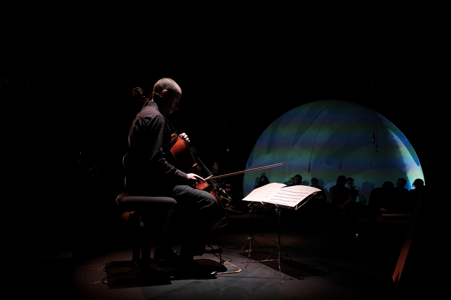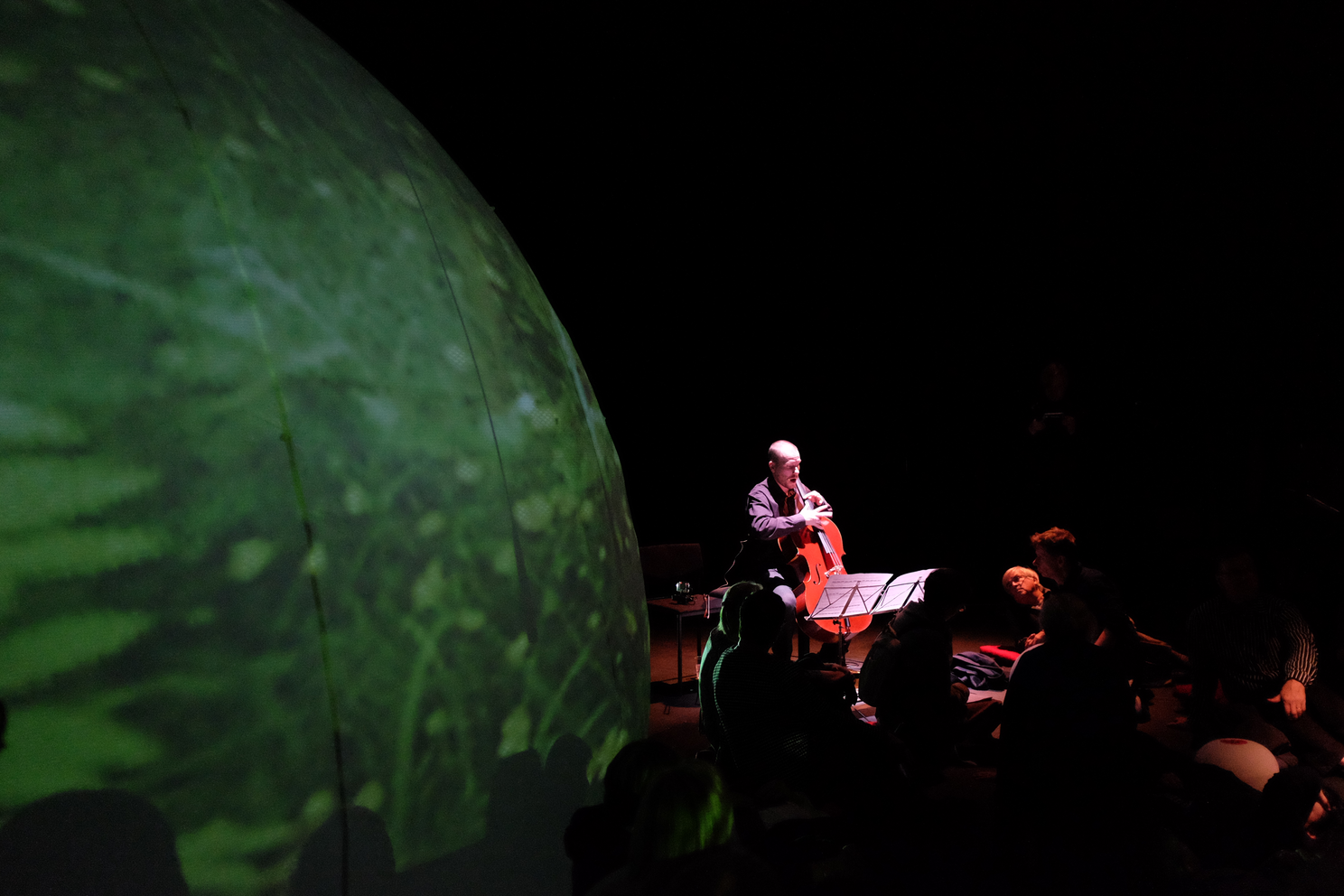 In Imaginary Spaces (Black Box, Helsinki Music Centre, Helsinki 18.10.2016 / Cable Factory, Valssaamo 10.10.2020) I had the interest to create a manifold performing space, where music would happen and be experienced in different locations (acoustic, virtual, imaginary) and in different ways, in an environment shaped by sounds, objects, and projections. It was a plural work in many senses, the first one I realised in a collaborative way – with the cellist/composer Juho Laitinen, the expanded cinema artist Marek Pluciennik, the media artist Roberto Fusco (Pugliese), and the scenographer Sampo Pyhälä. We had a three-day workshop in Kallio Kuninkala (the Sibelius Academy residency near Järvenpää) in preparation of the performance.