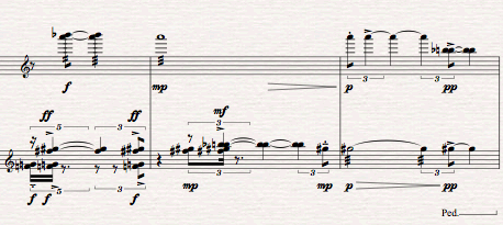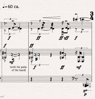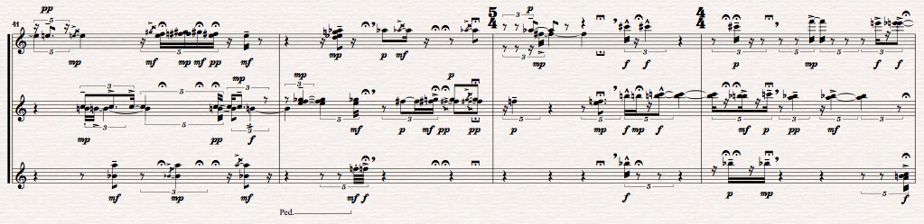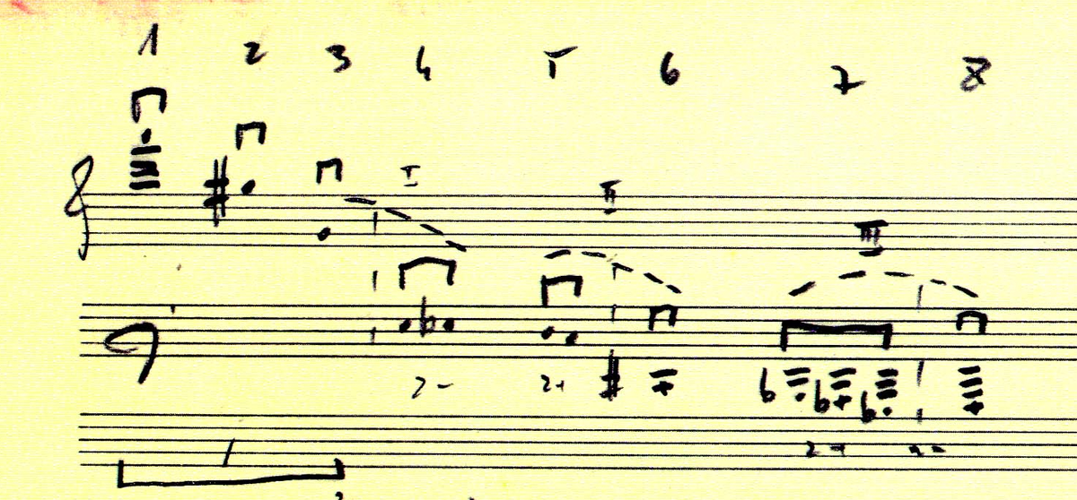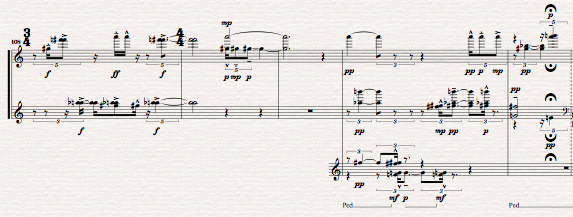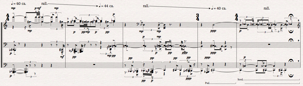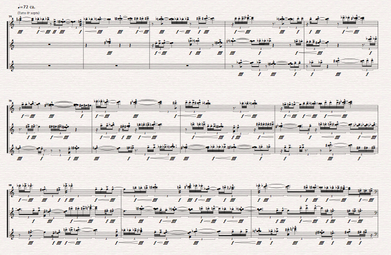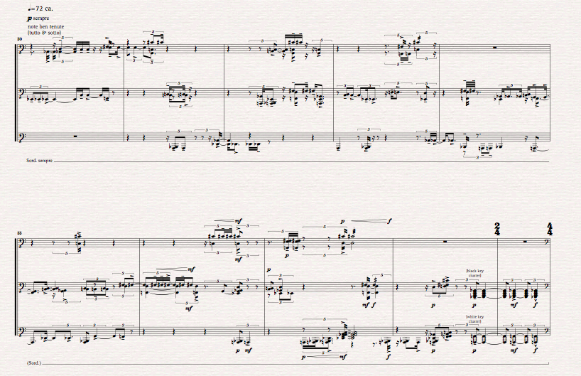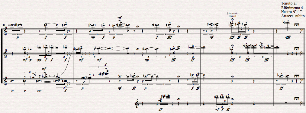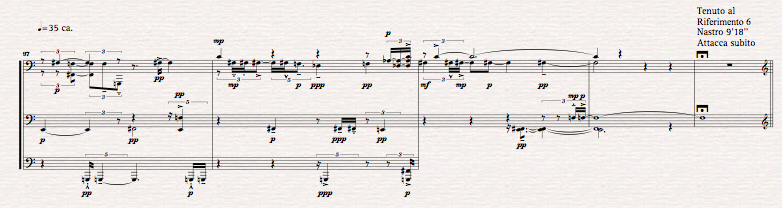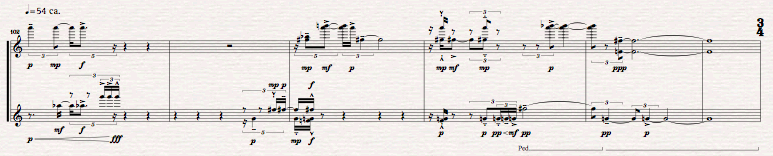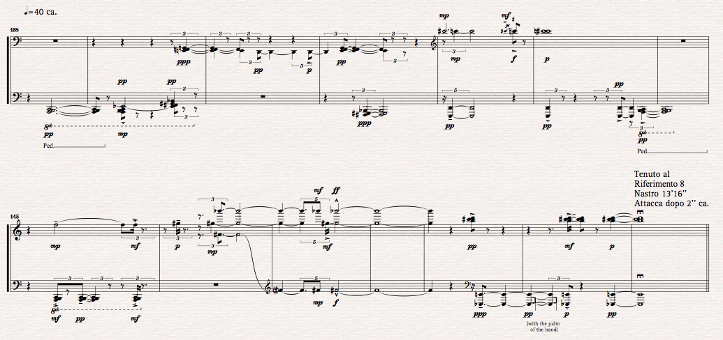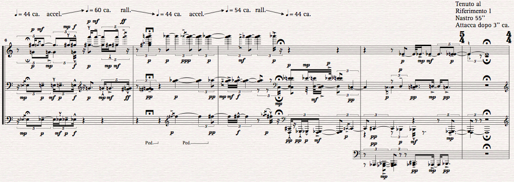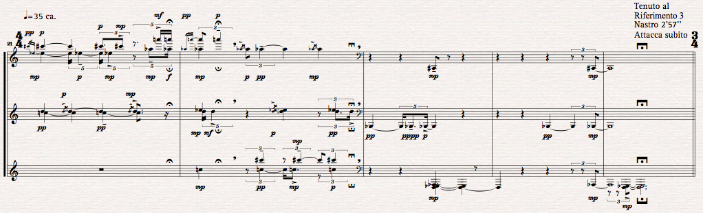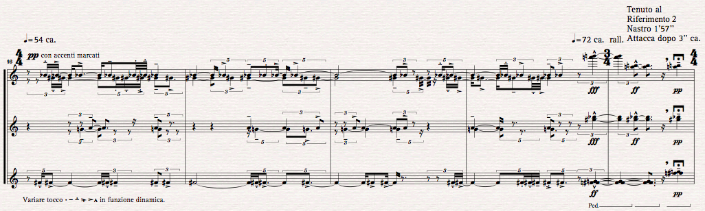 Module 3 conveys a complex analytical chart to …..sofferte onde serene…. It is intended for practitioners who are studying the piece (composers or performers), and it includes minute compositional details. It is made of four basic elements: (1) a graphic exposition of the score that renders visible the formal sections and subsections of the piece; (2) analytical diagrams focused on pitch and rhythmic structures/reductions; (3) audio recordings (piano alone, without tape) of every subsection; (4) denominations of the sections and subsections according to Luigi Nono (blue) or made by the author of this exposition (orange-red). Together, they allow recognition of some fundamental aspects of the score: (1) Form. A complex imbrication of sonata and variation forms, including an explicit ‘recapitulation’ after the climax, and ten implicit ‘variations’ on an underlying pitch structure. (2) Counterpoint. Use of imitative and canonic processes of writing. (3) Harmony. Use of ‘harmonic fields’, highly recognisable sound-aggregates with additive pitch processes; use of additive chord techniques, adding chords to one another but breaking their identity. (4) Use of rhythmic cells, small units that structure big sequences without serial/numeric controllers.