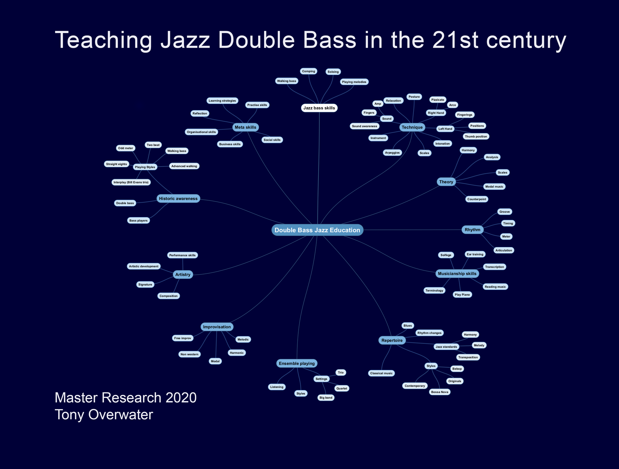 My initial plan was to do research and catalogue the available existing method books for Jazz bass education. But during the process I realized that matters were more complex than I had foreseen. Jazz (bass) methods were often based on classical music methods but Jazz education demands a different skillset and approach. I reexamined the fundamental building blocks necessary to successfully teach Jazz double bass. For this I designed a graphic theoretical framework that helped me analyze the existing methods. With this information I built a data base and webpage that offers analytical information about the available methods. Methods not limited to the traditional books but also on line learning programs and other methodical teaching material. Furthermore I examined the influence of the technological developments that the computer, smartphones, tablets and the internet have to offer. Teaching Jazz in the 21st century has proven to be much more of a modulair approach than the traditional linear approach.