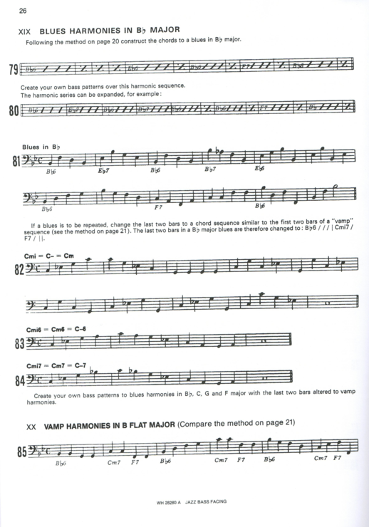 The method is mainly suitable for a beginner’s level. The methodic approach of building bass lines are simple but effective and the student is encouraged to create his own bass lines. Concerning walking bass lines, the method is limited to a blues and some harmonic cadences. There are no instructions for rhythm changes or Jazz standards. Being written in the late 50s and early 60’s the book gives a nice insight in the way blues was played in the early Jazz tradition. The use of a major (or maj6) chord is much more common on the first and 4th degree than often presumed. The general opinion is that a Jazz blues starts at a dominant seventh chord of the root (Blues in F starts with F7). In Pettiford’s bass lines and solos1 you can clearly see that he considers the root chord to contain either a major six or a major seven, except in the fourth bar where the dominant root chord prepares the fourth degree.