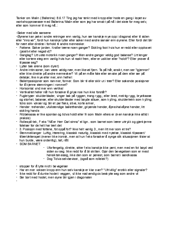 Som barn tilbrakte jeg en del tid på en spesialskole der min mor arbeidet. I arbeidet med karakteren Malin i Ballerina, kunne jeg hente fram vage minner fra mennesker jeg hadde møtt og «prøvde på» eller «smakte på» bevegelsesmaterialer jeg kunne erindre. Dette var intellektuelle minner, som møtte og dermed ble endret gjennom møte med min utførelse, min kropp og min sanselige fantasi og som ble en del av mitt potensielle fysiske rollemateriale.