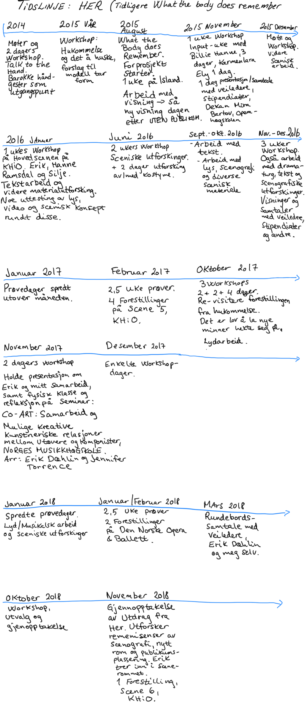Her er et verk som har vært i prosess gjennom nesten hele stipendiatperioden min. En viktig rød tråd gjennom stipendiatprosjektet mitt, har vært den langstrakte prosessen og tid til å møte materialene som utfoldet seg i prosjektet, i ulike faser og tilstander, som utøver. Å få møte minnene og tematikken, diskusjonene mellom Erik Dæhlin, meg og de andre aktørene i flere runder med workshops og forestillinger, har vært viktig for min utvikling og for at mange refleksjoner, som også har påvirket andre deler av stipendiatet mitt, skulle få vokse frem.
