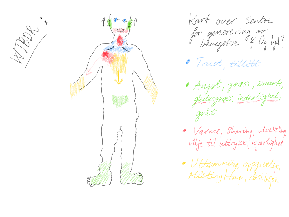 Jeg skrev en tekst i natt (så hadde glemt nå at jeg hadde skrevet den). Den er litt svulstig og slikt, som tekster kan være på natterstid, men den springer ut av et lite kart jeg satt og tegnet på en forelesning her en dag over hvor hvilke bevegelser eller hvilke sentre i min kropp hvilke bevegelser springer ut ifra.