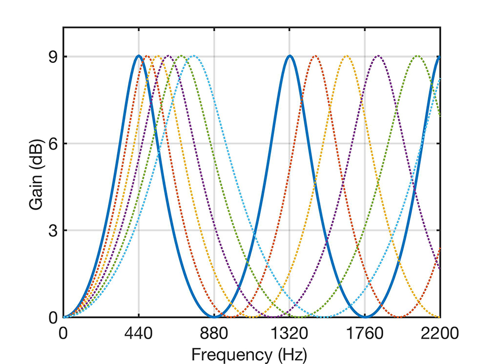Figure 2. A family of gain over frequency functions showing the variations in comb-filter patterns that were imposed on the synthesized signals (labelled “tonal processing” in Figure 1). Note that the 0-dB value on the y-axis indicates gain relative to input, and thus indicates unity gain here. The frequency-dependent gain of the filter shows regularly-spaced peaks typical of open tube resonances (at frequencies of F, 3F, 5F, etc.). The blue solid curve shows the comb-filter resonance pattern with its first resonant peak at F=440 Hz, the highest fundamental frequency of the input to be applied to the filter). The dashed lines show the remaining five featured comb-filters exhibiting resonance patterns beginning with a value of F set to progressively higher frequencies.