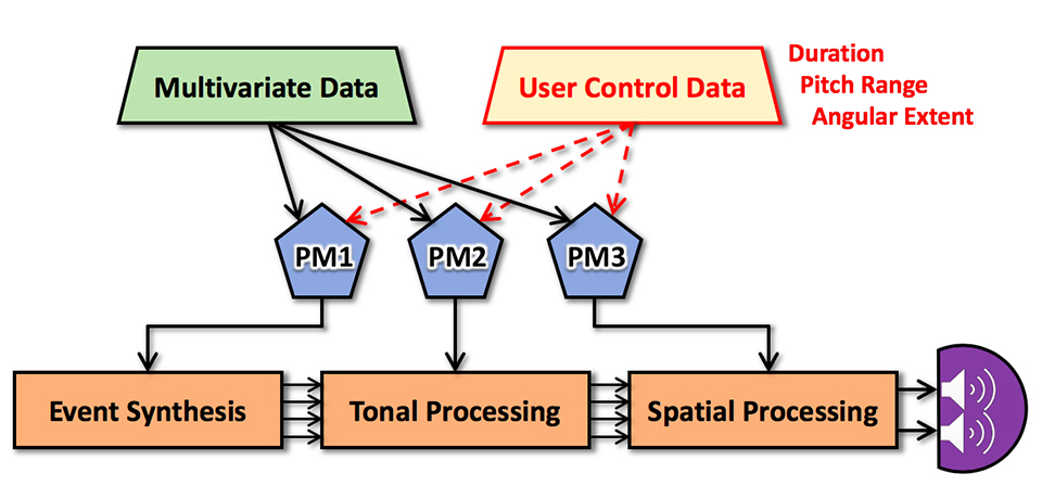 Figure 1. Flowchart representing the sound processing employed to produce the examined sonifications. Trapezoidal boxes show the data inputs to the system, including the input multivariate proteomic data and user control data; pentagonal symbols represent the potentially complex “parameter-mapping” operations in which user control data modifies the mapping into audio signal processing of the multivariate data; and rectangular boxes represent signal processing modules, which pass audio signals rightward in the flowchart toward adjacent modules, ultimately for auditory display. The number of arrows connecting signal processing modules indicates the typical number of audio signals that are passed in parallel, thus the spatial processing module shows only two outputs, since headphones are assumed to be the target reproduction system. (The alternative output to loudspeaker arrays might include common main channel counts of 5, 7, 10, or 22, with the addition of a variable number of low-frequency channels, most commonly only 1 or 2.)