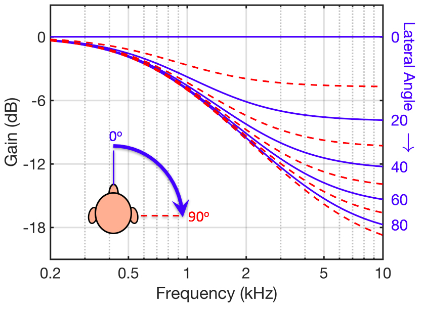 Figure 3. A family of gain over frequency functions showing the output results for the “head-shadow” filter that was applied to the contralateral ear signal (as a key component process within the “spatial processing” module shown in Figure 1). The frequency-dependent gain of the filter shows increasingly greater attenuation at higher frequencies as the lateral angle of the input source grows from 0 degrees (showing no attenuation) to 90 degrees (exhibiting attenuation greater than 18 dB at the highest frequency shown). This 90-degree range of virtual-source lateral angles appears within the inset graphic showing a top view of the listener’s head. The blue solid curves show the filter gain for five specified lateral angles in 20-degree steps from 0 to 80 degrees. To aid in distinguishing adjacent curves, the line style alternates between blue solid lines and dashed red lines, which show the filter gain functions for intermediate lateral angle values, ranging from 10 to 90 degrees, again in 20-degree steps.