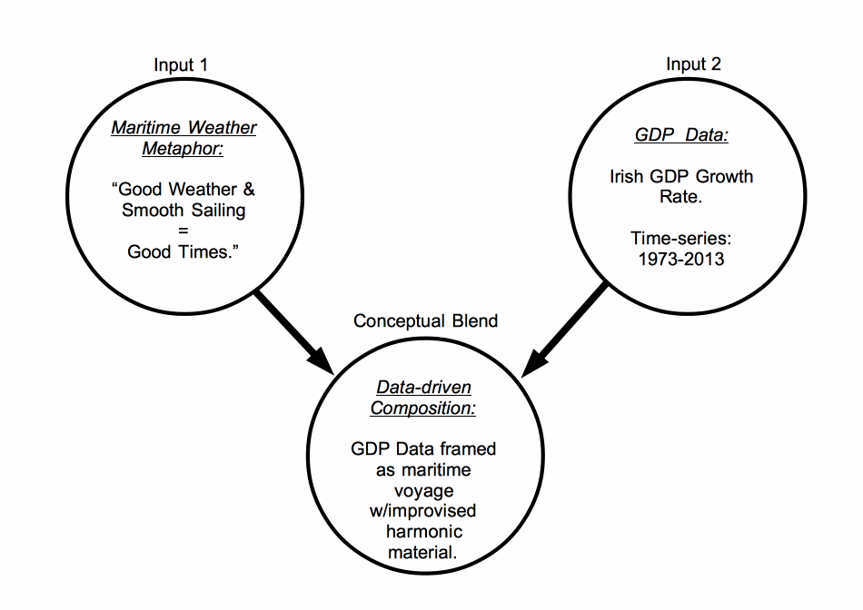 Roddy (2017) explores another embodied cognition approach to representing data from the Irish financial crash and recession in the data–driven composition “The Good Ship Hibernia and the Hole in the Bottom of the World.” This piece makes use of soundscape recordings which are mapped to represent Irish GDP growth rate from 1979 to 2013. The piece is structured using the conceptual metaphor of a maritime journey where “smooth sailing” and “good weather” represent “good times” and “rough seas,” and “bad weather” represents “bad times,” a conceptual metaphor first discovered and studied by Izabela Zołnowska (2011). The piece is further structured on the basis of Johnson’s (1987) balance schema in so far as data is communicated as a function of the balance between two soundscape elements in the piece. This balancing was achieved by simple amplitude mapping. Harmonic material, consisting of an improvised guitar performance in response to the shifting soundscape of the sea journey, is also heard throughout the piece. There are two distinct forms of harmonic material present a foreground melodic component and a background chordal accompaniment. The individual notes and chords are not directly determined by the data but are rather an interpretative response to the shifting soundscape. This was intended to provide a background context against which the changes in GDP might be rendered more obvious. The perceived audio fidelity, salience, and timbral character of the improvised material is also determined by the GDP data, with low GDP mapping to a noisy timbre and loss of amplitude (so that the harmonic material is overcome by the sounds of the storm). The piece was composed as a conceptual blend where the maritime weather metaphor provided the framing structure and the data was mapped to determine how the piece unfolds. The improvised harmonic material was intended to provide a baseline against which changes in the soundscape could be interpreted. This approach is illustrated here.
