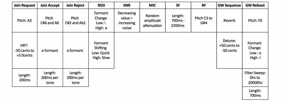 SF also contains 6 levels: SF7 to SF12. Given that the spread factor is a measure of the length of time taken to send a message, we created another more direct mapping strategy. The length of the sound is controlled to reflect SF: longer SF factors correspond to longer phrases. The Just Noticeable Difference (JND) for a tempo change in speech is estimated at roughly 5%, which suggests that a listener will detect a change between a 500ms vocalization and a 525ms vocalization (Quené 2007). The timings used here fall well within those limitations. SF7 is assigned a length of 700ms, and each following SF is incremented by 300ms, up to 2.2 seconds for SF12.