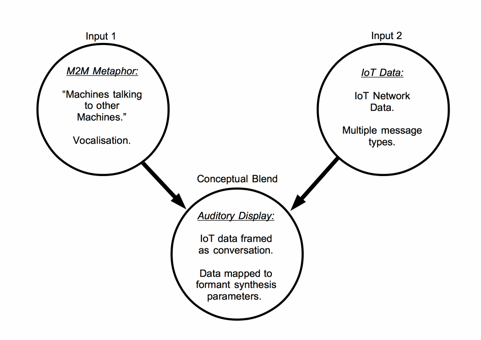 A recurrent metaphor employed across the IoT literature to describe M2M communication, reflected in the above quote from Tan and Wang, is that of “machines talking to each other.” Drawing from Imaz and Benyon’s (2007) recommendations to structure HCI design on the basis of conceptual metaphors and blends, this metaphor can be adopted as a frame of reference for our auditory display design. The auditory display can be conceptualized as a blend between the data and sound, framed in terms of a conversation between machines (see figure 2). Designing this interpretation of M2M communication into our auditory display might help to make it more intelligible to the listener and support them in understanding and reasoning about the data. Other relevant work in fields related to embodied cognition can be called upon throughout the design process to further inform and refine design choices.