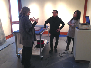 Once the previous show was deinstalled in December 2016, we had full access to the gallery, and started immediately once Deborah’s paintings were delivered. We worked on the exhibition every day, in the evenings, and on the weekends. Snacks were supplied and consumed. A critical period of making, testing, and building in the gallery was done from 19 December 2016 through 3 January 2017 when classes were not in session and the campus was closed. The weeks of 9 and 16 January 2017 were particularly intense as the exhibition was scheduled to open on 20 January.