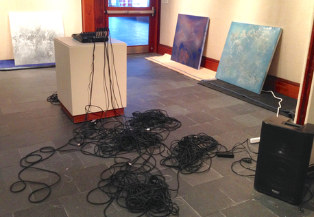 The installation was done in waves. Some of the components were made by the artists in their individual studios ahead of time. (The images in this exposition do not contain working documents or images from the artists’ own studio practices, but from the curatorial project as it developed in the gallery.) Other aspects of the installation were created in the Music Department's digital recording studio or with school A/V equipment. Some of the components were borrowed from gallery staff or other employees, found at hardware stores and retrofitted, or created on the spot.
