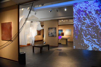 We considered the potential spatial and kinesthetic qualities of the piece through a paper prototype and examined it from different levels as well as from the outside of the gallery. We tested several of Deborah's paintings behind the “sail” (eventually made of scrim and tulle) to investigate: How does it look from in-between? How do you apprehend it from around the corner? How does it appear from overhead? Will the audience crawl under it, walk around? Next, we determined the end of the piece's extension into the front gallery space, as intersections between works and spaces was an important aspect of our ideas of encounter. We continued to tweak the installation in relation to the other works as the installation process moved forward.