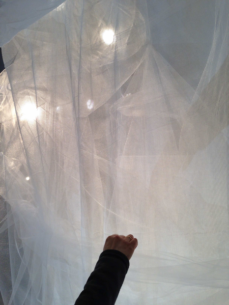 In addition to the elements described and pictured in the Wavering Lines section (which for some people would indicate the “final” form of an exhibition), we all continued to tweak and adjust the exhibition throughout its run. This was an almost daily ritual, where the compulsion to touch became a talismanic gesture. This included adjusting the video (angles, brightness, loops), the sound (volume, direction), the sand and salt (sweeping, redrawing, replenishing), the scrim (straightening, fluffing), the lighting (adjusting as needed, which often doesn’t become evident until a few weeks in, as well as adjusting and dimming for select events), the mirrors (angling, shifting their placement), and the paintings (leveling, or angling, as necessary, or adjusting in other ways). This continuous shifting of elements, positions, and attitudes, with a sustained attention and curiosity on the part of the collaborators and the audience, created a type of curatorial dramaturgy of journey, investigation, and experimentation throughout the project.