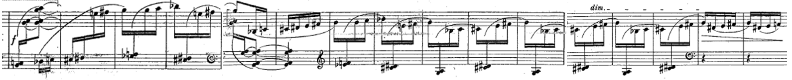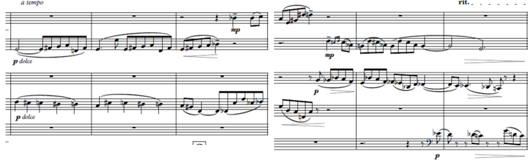 Before delving into each of the different challenges that were faced, here is a small fragment to demonstrate some of the various thought processes that were employed throughout arranging the entire work. It may be easier to understand the following descriptions after first having a brief encounter with the practicalities involved. Consider this small fragment below, a delicate interweaving passage from the first movement of the Schulhoff Piano Sonata.