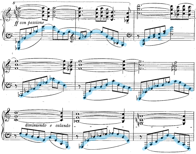 The first movement, in its flowing, lyrical entirety, oozes French Impressionism in harmony and texture, and inspires beautiful and intricately interweaving lines. In order to try to capture this quality from a piano score, which already implies and occasionally clearly depicts desired changes in the voicing, one must interpret the often single continuous melodic line, splitting it between the voices as desired.