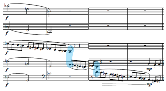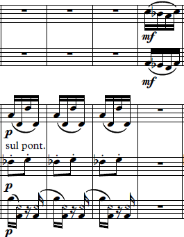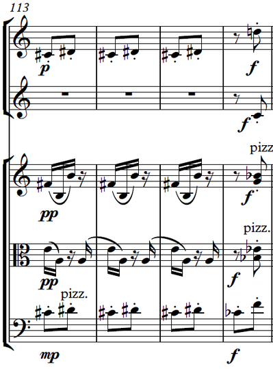 Unlike the piano, with its limited range of playing techniques, the instruments from the ensemble have the ability to quite drastically alter the quality of the sound they produce. One obvious and very useful example is pizzicato in the strings. By plucking the string a more immediate and almost percussive energy can be instilled into the sound at the cost of a controlled sustain and volume in the case of the upper strings. In the 4th bar I made use of this technique in the double bass part. Although it may only be subtle, I hoped this change of colour may emphasize the ascension of the melody and subsequent transition to the following musical material of contrasting texture and character.