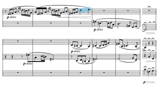 Shown below is the opening material from the second movement. This theme appears three times throughout this brief movement. Each time it returns, I make a change in the timbral contrast, emphasising the sparkly energetic character. This allowed me to explore how different combinations of instruments and techniques can still create similarly juxtaposing effects.