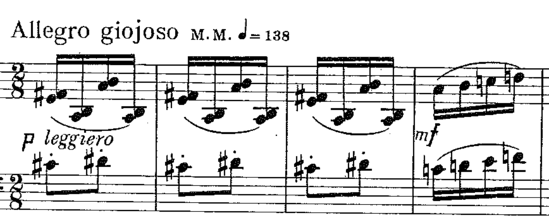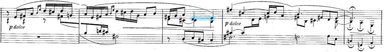 The contrasts between each of the movements are starkly clear, and this is no exception for the finale. After the serenity of the third, the jovial, unsupressable excitement of the folk dance to follow completely takes you away. The suggested voice leading and interactions enhance this change in mood as well. Not unlike the fragment first shown, this passage depicts voices talking over one another, but in an exaggerated manner, almost like a constant chatter. The busyness becomes energy in itself propelling the phrase forward.