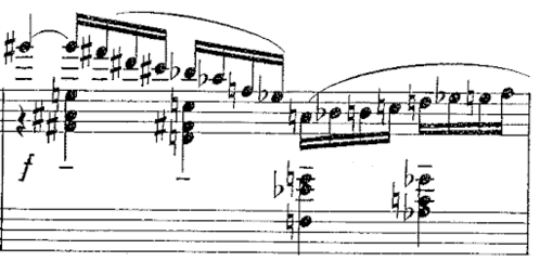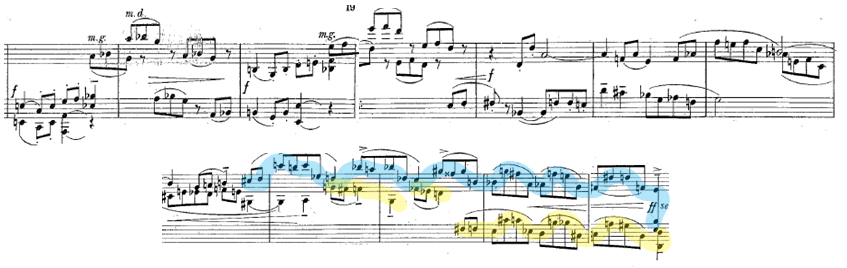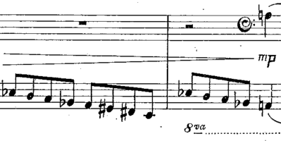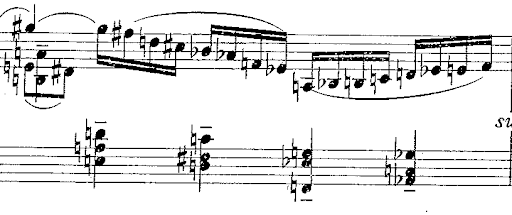 In the fourth movement, Schulhoff makes use of this feat, writing many descending scalic passages that cover over three octaves, often going way past the range of any single instrument in the ensemble.