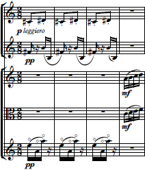 As you can see in the original from the piano score, the dynamics are limited to pp with a few hair pins. However, I felt there is an implied importance in the re-articulation of each D, so I tried to demonstrate this with a p for each new interruptive entrance as opposed to the to the pp of the accompaniment.