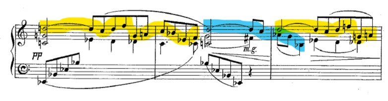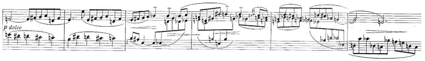 Before delving into each of the different challenges that were faced, here is a small fragment to demonstrate some of the various thought processes that were employed throughout arranging the entire work. It may be easier to understand the following descriptions after first having a brief encounter with the practicalities involved. Consider this small fragment below, a delicate interweaving passage from the first movement of the Schulhoff Piano Sonata.