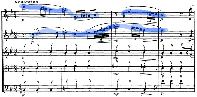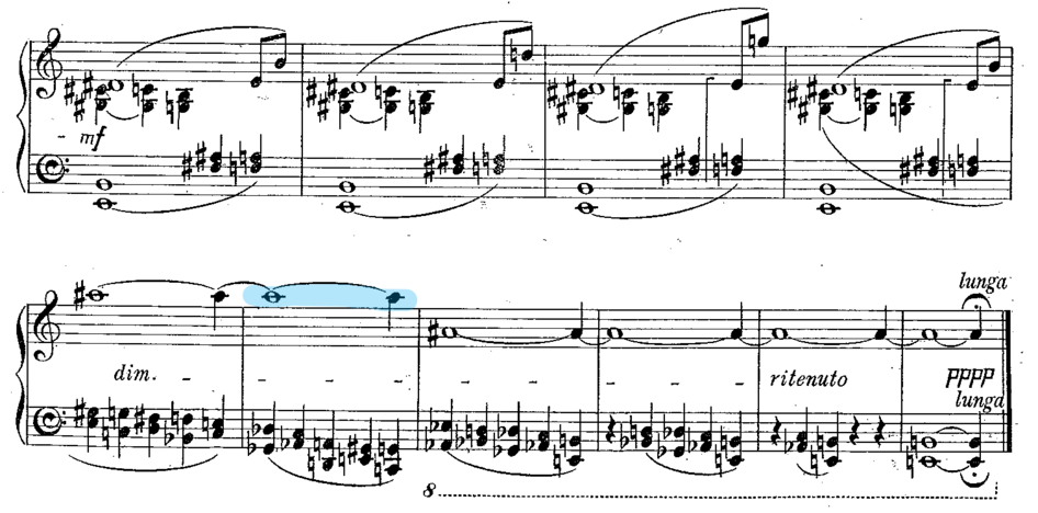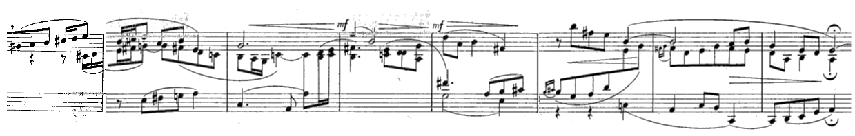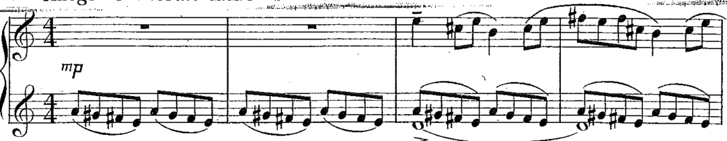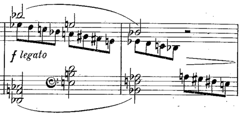 The first movement, in its flowing, lyrical entirety, oozes French Impressionism in harmony and texture, and inspires beautiful and intricately interweaving lines. In order to try to capture this quality from a piano score, which already implies and occasionally clearly depicts desired changes in the voicing, one must interpret the often single continuous melodic line, splitting it between the voices as desired.