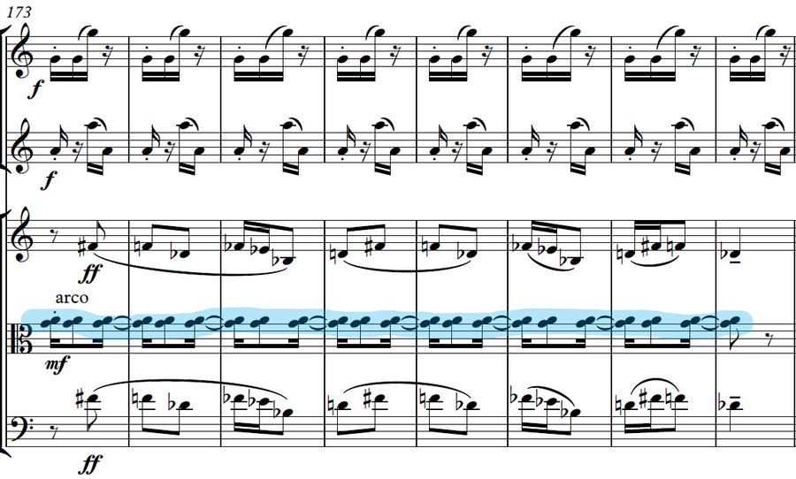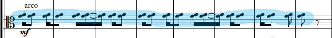An excerpt that I realised needed refining is a moment from the end second movement. I am very conscious of how equal the parts are, trying to share enough of the interest between all the instruments. We have seen this fragment before, where the bass and violin are in octaves. The woodwinds have all the other notes covered, however I felt this would be a great tutti moment. Initially I asked the viola to provide a driving syncopated rhythm, hoping for it to merge with the texture of the woodwinds.