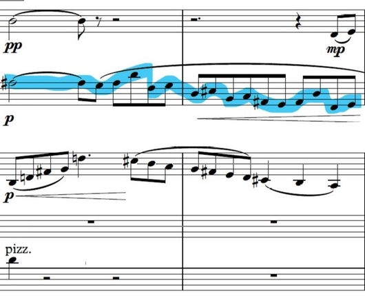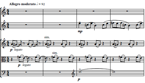 In the first utterance, the oboe in a very low register provides the driving motif while the clarinet and bass form the rippling waters beneath. The upper strings interject with a substantially present and almost sneering mf ascending run.