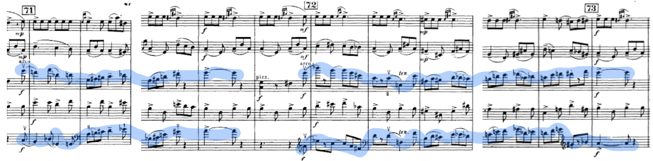 In order to try capture and recreate this effect, I have passed these lines across one or two instruments. I have also employed a technique called “dove-tailing” which means that there is a overlap at the change of instrument. A little bit like during a relay, where both runners may be gripping, even momentarily, the baton at the same time in order to securely pass it on.