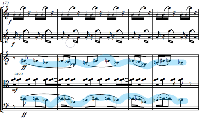 And finally, bass pizzicato, coloured by the low oboe, or perhaps visa versa, present the motif while upper strings again flutter by. The contrast is provided by pizzicati in the strings with a similar attack from the winds, creating a short sharp chord. Here it is more the dynamic contrast rather than an added timbral change that creates the most impact.