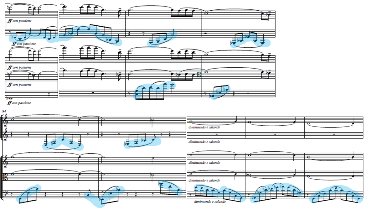 In theory I thought it would work, however in practice, maintaining a consistent syncopated quaver rhythm in such a quick tempo within a texture where down beats are not so clearly emphasised didn’t quite work. I therefore made this compromise, creating syncopation with an offset rhythm of three against four, a pattern that is more practically compatible with the surrounding texture yet still adding an extra motivic drive.