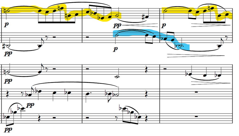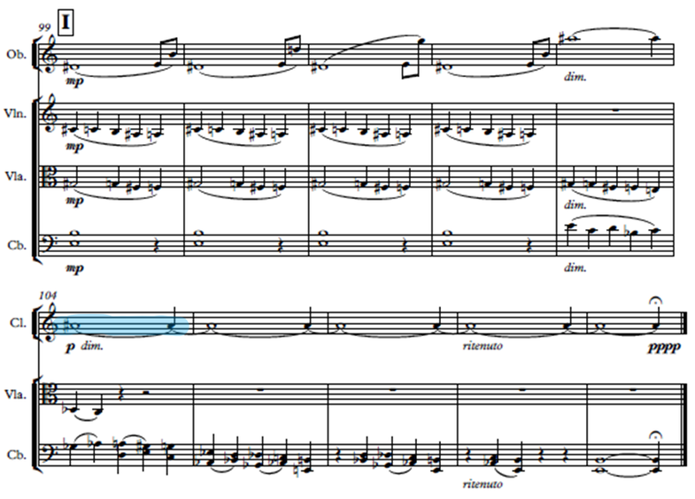 This inspired my choice to try and pass melodic material as seamlessly as possible between voices in the Schulhoff. This is most evidently seen in the primary thematic material which begins the whole sonata, with the clarinet and oboe passing the melody between them. Not only did I do this with the melody, but the counter melody as well, hoping to create a sense of movement and flow in the music and on stage as well. I felt this fits well with not only the melodic material at hand, but also enhancing the overall imagery, in this first movement in particular.