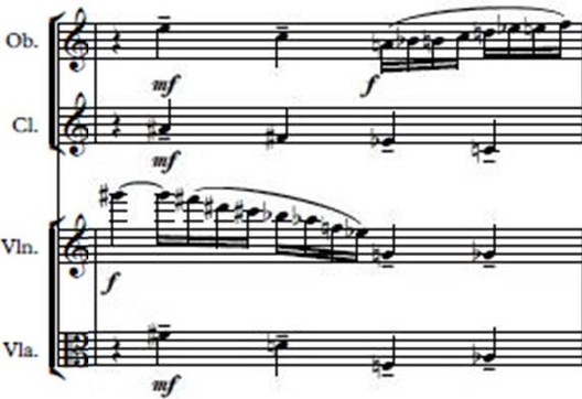 To achieve this synthetic resonance I again used a little overlapping, to create more of a wash of sound. I did this by interweaving the line between violin and viola, alternating every two notes, asking for a slightly longer duration on the second note, so it may spill into the sound of the following note. I feel this worked in creating somewhat of a dreamy, airy texture for the clarinet to join with its lively folk melody.