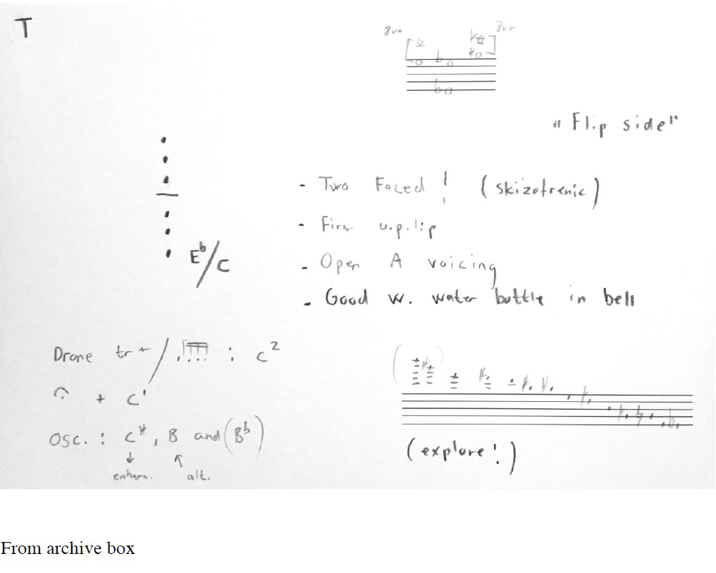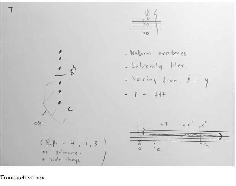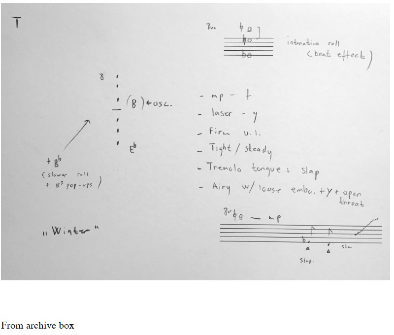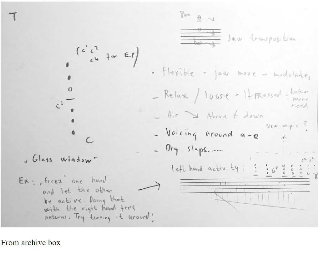 Correspondingly, some of these methods and considerations are documented in sketchbooks/notebooks and in the end found their way into what I call my ‘personal library of multiphonic findings’, manifested in a wooden archive box: