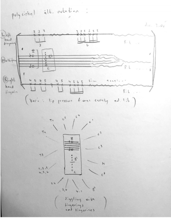Here are some other examples of a possible notation of the technique, taken from some of my notebooks. I call it “Polycirkel” here and excuse my Norwegian writings here and there: