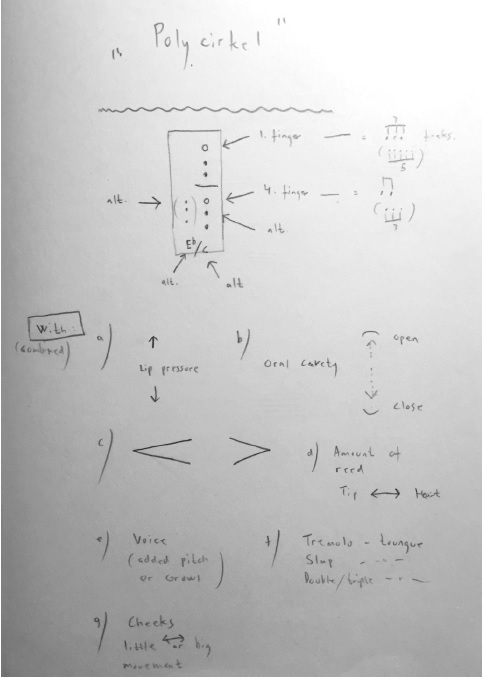 The multiphonics are primarily discovered during solo improvisation, exploration and experimentation. Many of the multiphonics I try to reach for provokes the instrument’s resistance. In return, unfamiliar sounds are extracted from it. For my own sake, I immediately write down my multiphonic findings along the way and also apply them into a possible musical situation (arguably to varying degrees of success). Nevertheless, it helps me to memorize them better and draw associative (metaphorical) inspiration from them. Later they are worked on for further control and also combined with other sonic findings. Either they get stabilized and incorporated in my playing, or they are passed over for the moment, to be further investigated and unpacked later. The task is then to fine tune them, adding all playing techniques imaginable, and finally listening to the depth of details to be found. Slowly even the most complex multiphonics begin to reveal within. In this way, I try to explore the methodology in the construction of each sound – always with an auditory awareness of the poetics. My intuition and my ear is the authoritative guide here and to a lesser degree do I try to understand the intellectual construction of them – theoretically or mechanically. Since playing solo is also the performative format of my project, this idiosyncratic working method seems particularly suitable.