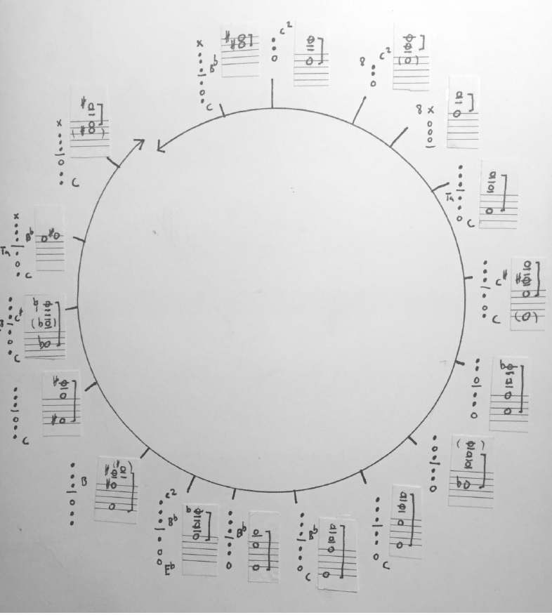 In the Sulphur Harmonics piece on the Plateau album I wanted to exclusively work on that idea. Only the clean multiphonic without any applied effects. As the title of the piece might suggest, these ‘chord’ are not totally in equal tempered tuning always, furthermore if one aim for only two pitches to sound, often contours of other harmonics occur. Nevertheless, there are many melodic and harmonic possibilities here. As a working sketch for that piece I wrote a circle with some prospects: