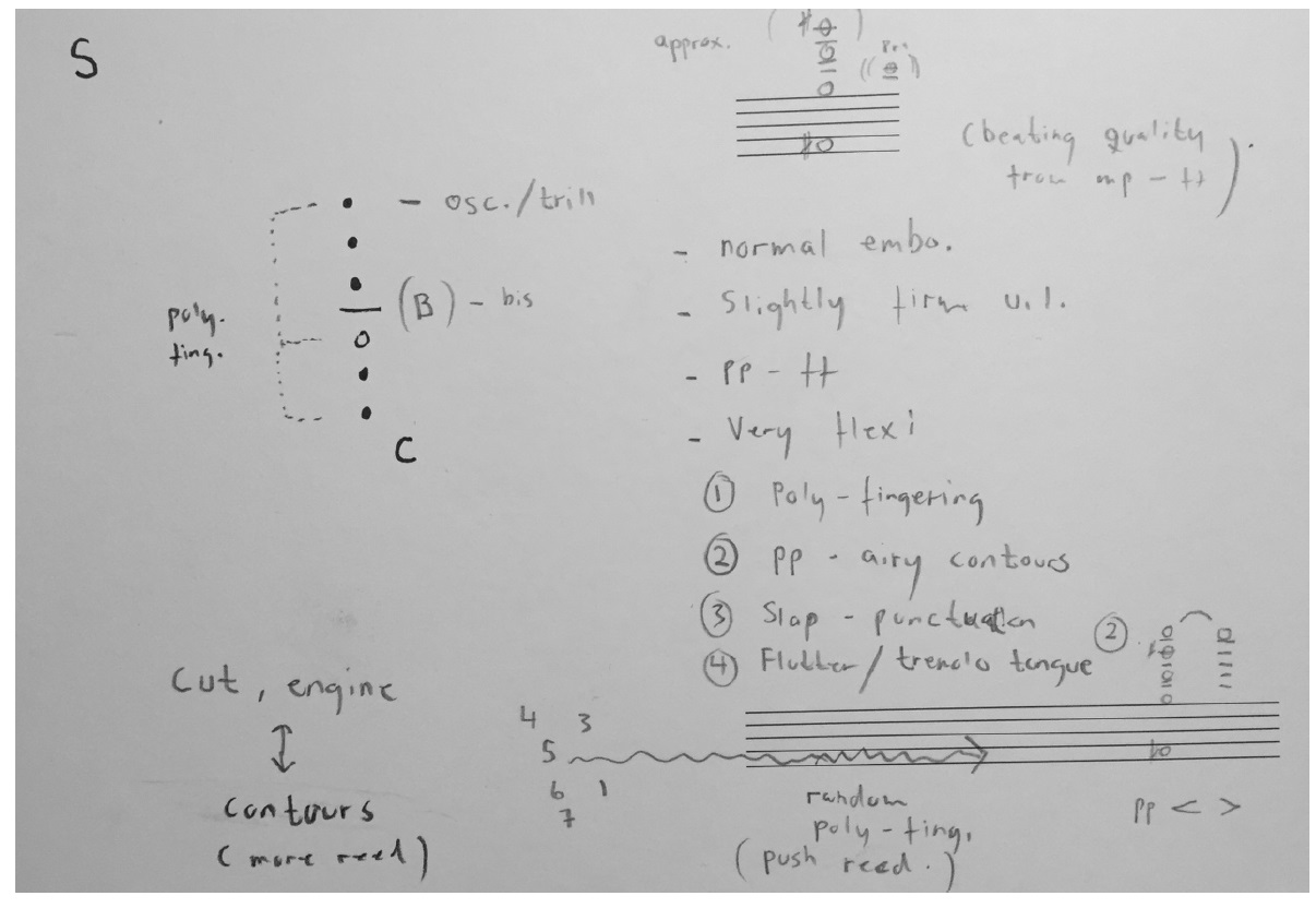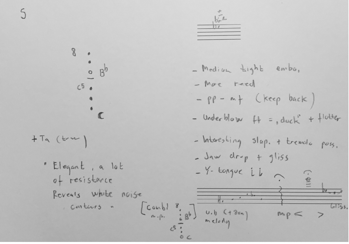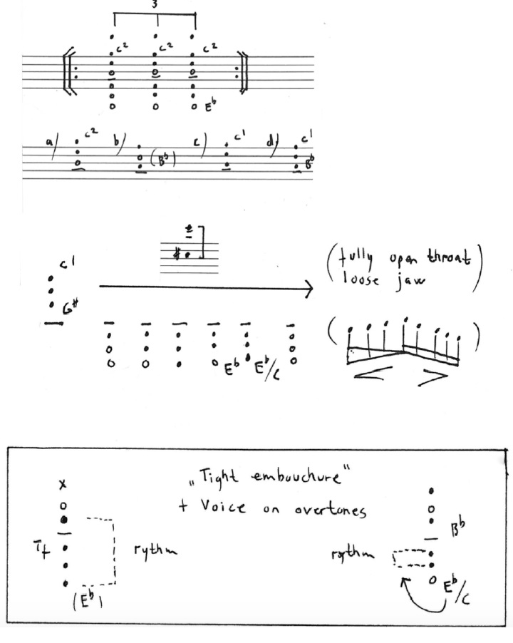 As one can see from the information I have given myself here, it has many other possibilities of being superimposed by ‘further manipulation’ techniques: Under-blow (very low jaw position) in fortissimo creates a ‘duck’ like sound. A high tongue position (vowel- y) can create high harmonics and be very articulated as well. There are glissando possibilities, slap and tremolo tonguing, and trills. Also a combination multiphonic that is both mechanically easy and harmonically interesting. On the bottom note line, at the beginning, there are small notations on a u.b. melody (under-blow with octave key), playing with octave key on, but push the jaw so low down that it creates pitches approximately an octave down (only in some cases, as it can also be a not equal tempered 7th or 9th down.) When played very soft this also creates a reference to ethnic wooden flute. These small melodies occur many places in the mentioned Sea Meet Shore (5:29 for example) They are often a ‘true’ multiphonic since they tend to have contours of harmonics around them.