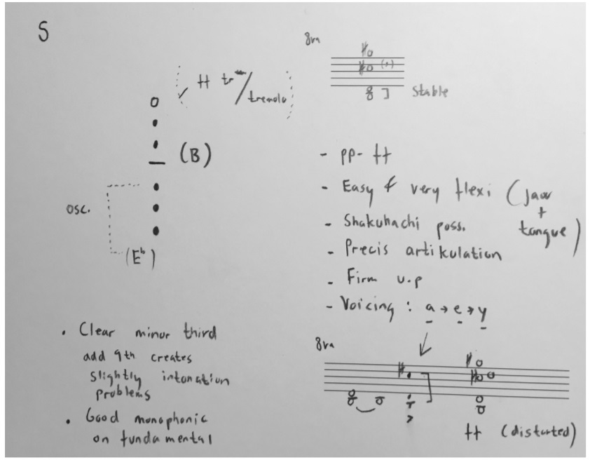 Good for precise articulation/punctuation. Osc. is short for oscillation possibilities and shows which keys. There is also information on ff (fortissimo) trill/tremolo. Finally, it says Shakuhachi possibilities. This means isolating one pitch to use it as a monophonic sound (in this case the fundamental/lowest pitch in the multiphonic) My reference here is the wooden breathy quality of the Japanese flute Shakuhachi.