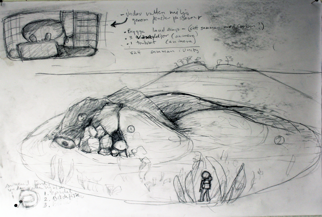 3-D landskapet som animeras i Unity blir till två  filmer med var sin funktion, den ena filmen anpassad för ett par googelglasögon med vilka man kan få en virituell upplevelse av att besöka undervattenslandskapet.
