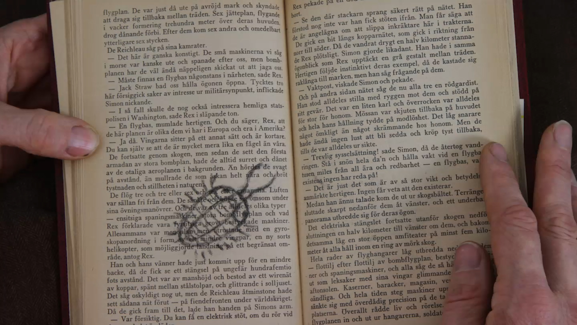 På ett bord i biblioteket ligger en bok, när ett blad i boken vänds aktiveras en film.