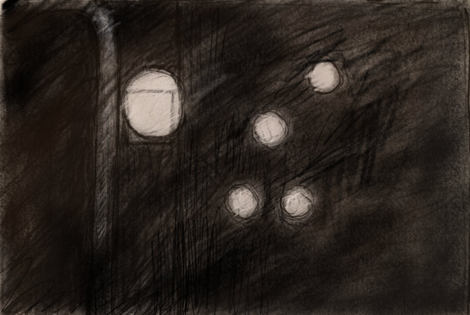 Tekniken är videomapping. Me enkla stiliserade animatiioner skapar jag en fösta entre till mobilis in mobili. En enkel ljuskägla som rör sig över rummet, stannar till över en iformationsskylt, visar mot viktig information. På den stora väggen öpnnar sig den pulserande kartan och en streckad linje över framfarten. kartan bryts upp av organismer.