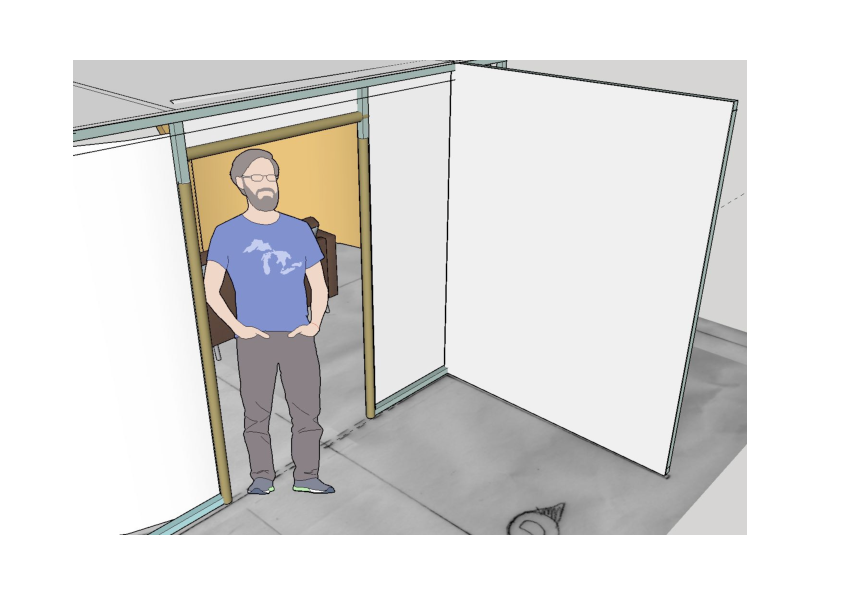 Av banankartonger bygger jag en ställning för projektor att stå på. 2 meter ovanför tänkt dörr, riktad mot den utskjutande entrén.