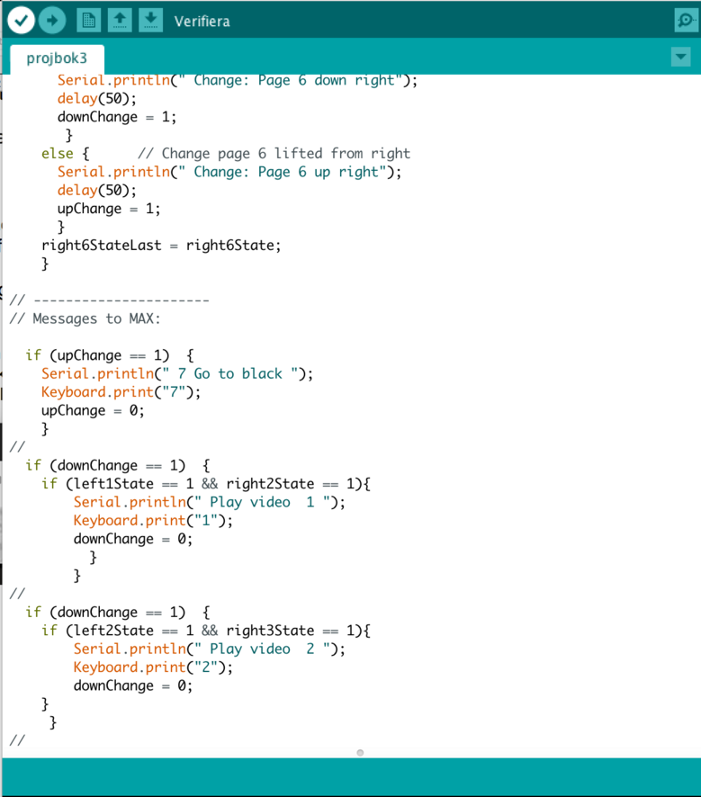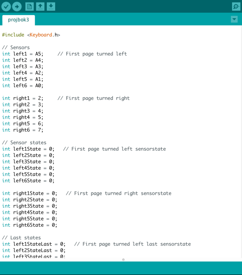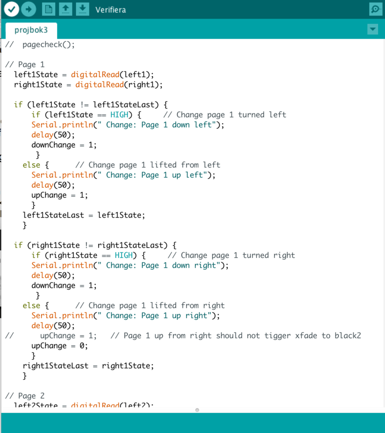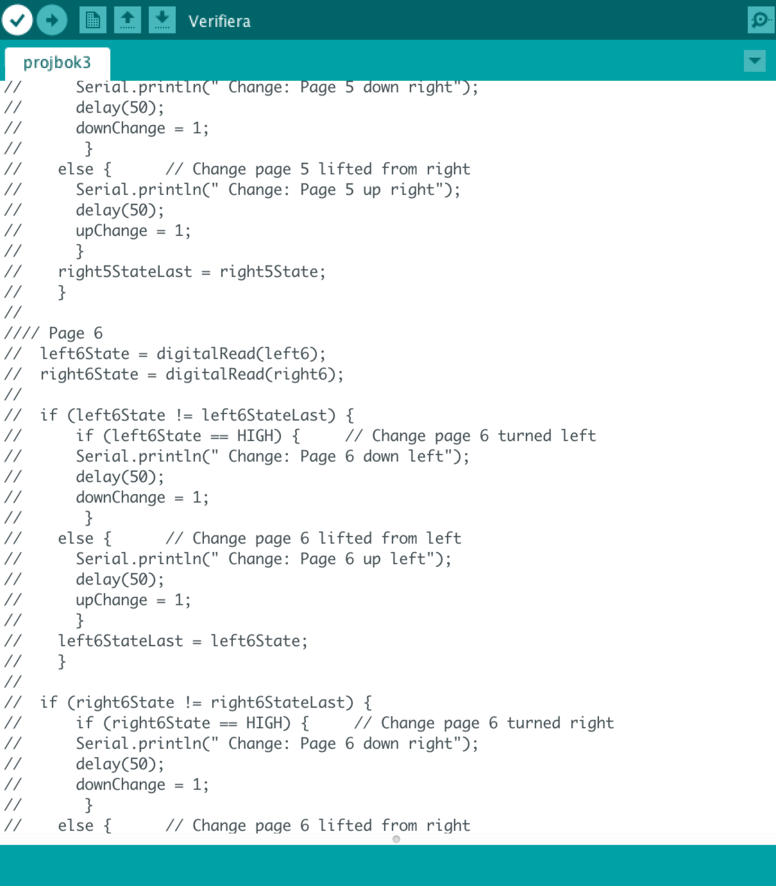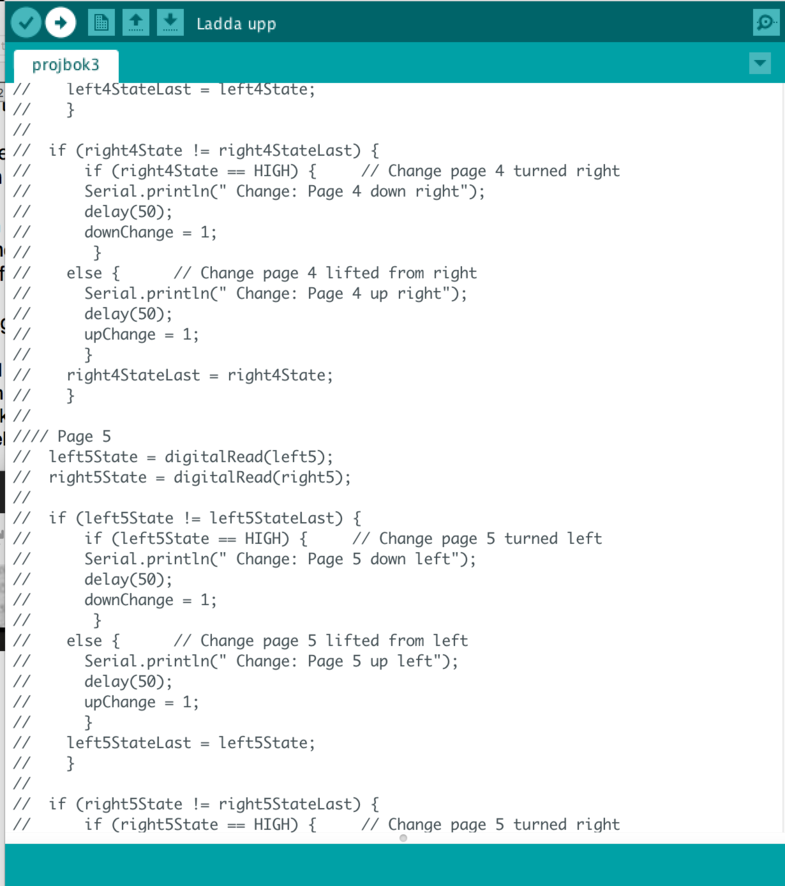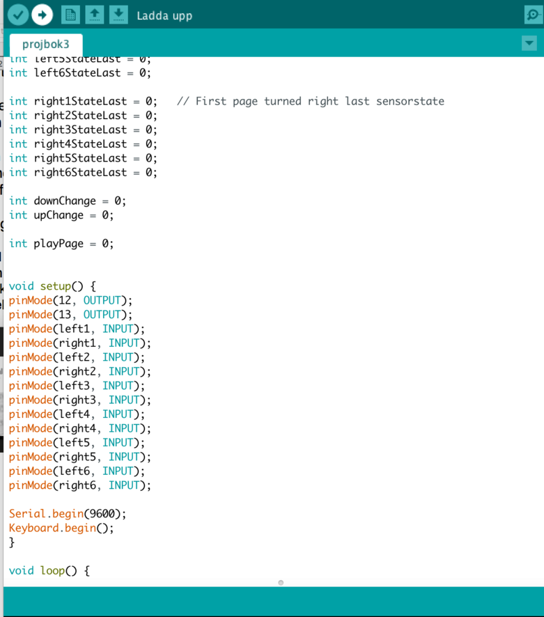 Boken styrs av sensorer som triggas av magneter dolda i bokens blad. Signalerna från sensorerna leds till en arduino. En kod skrivs för att bestämma hur filmen spelas och stängs av beroende på hur sidorna i boken vänds. Mediaspelare Max är i sin tur uppkopplad mot projektorn.