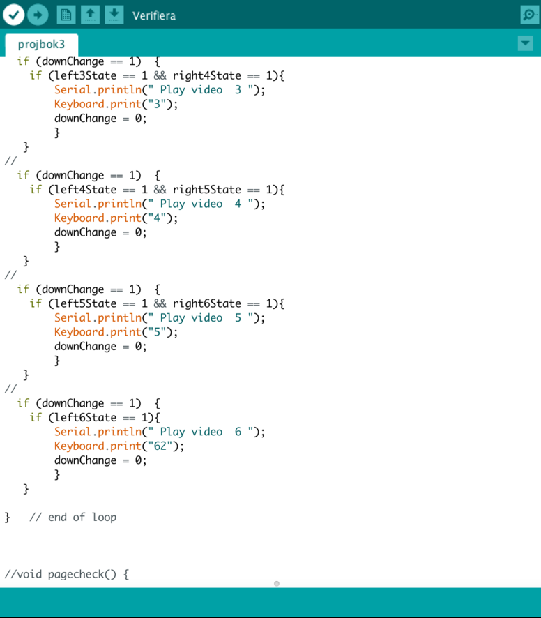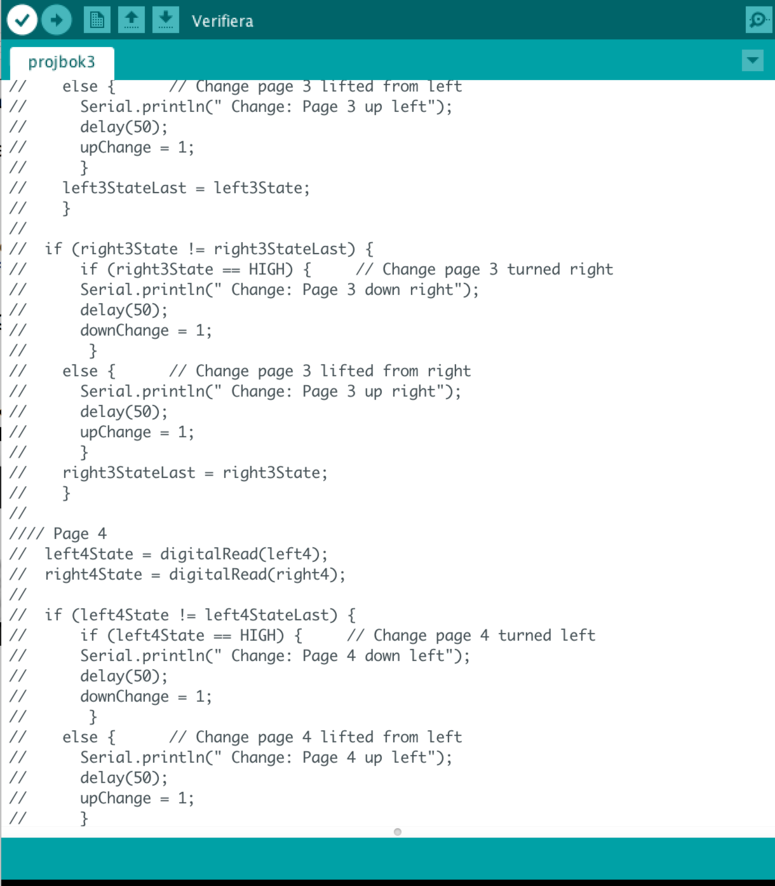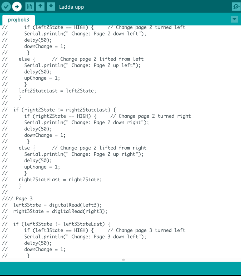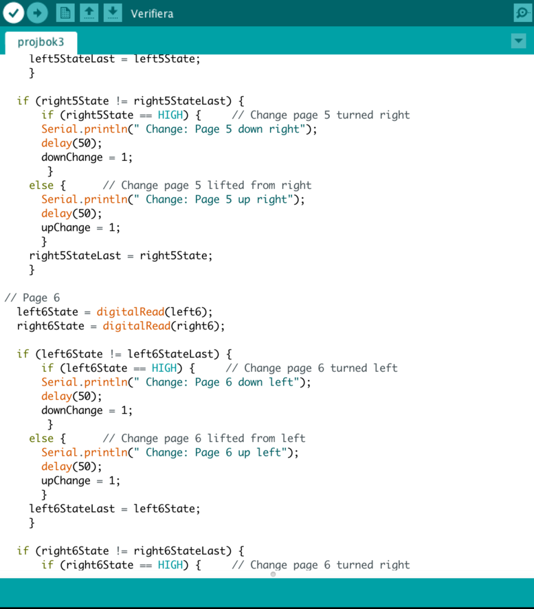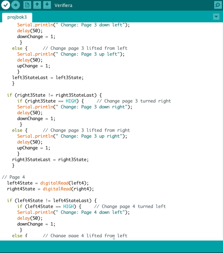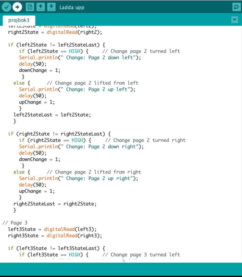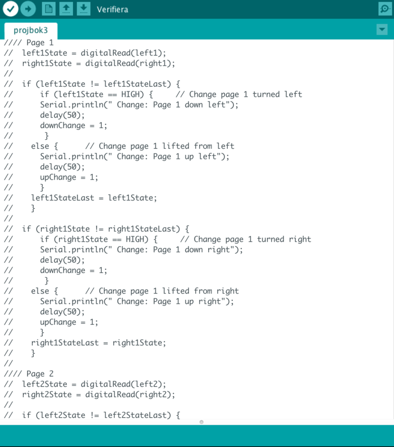 Boken styrs av sensorer som triggas av magneter dolda i bokens blad. Signalerna från sensorerna leds till en arduino. En kod skrivs för att bestämma hur filmen spelas och stängs av beroende på hur sidorna i boken vänds. Mediaspelare Max är i sin tur uppkopplad mot projektorn.