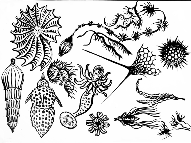 Små havslevande mikro organismer som radiolaris med sina vackra kiselstrukturer dom vill jag ska ta över mina böcker. Majid Modir, grafisk designer, har på annat håll skissat upp en affisch. En del av designen är ett mönster skapat av små vattenlevande djur.