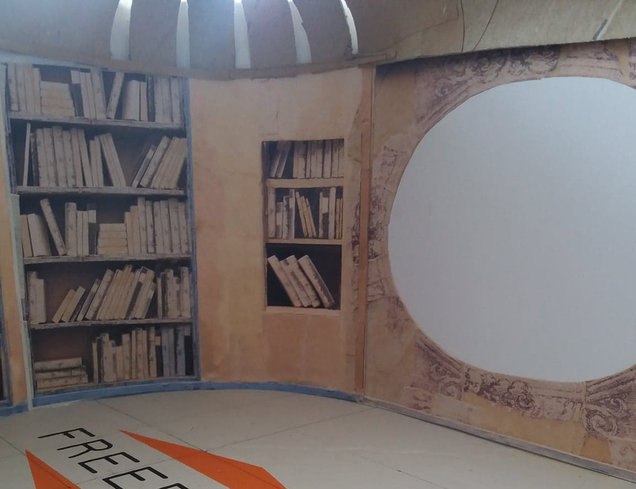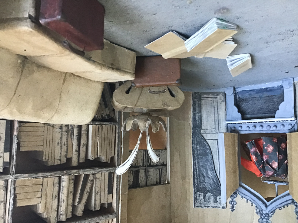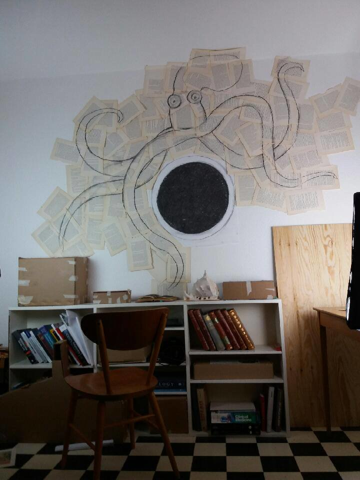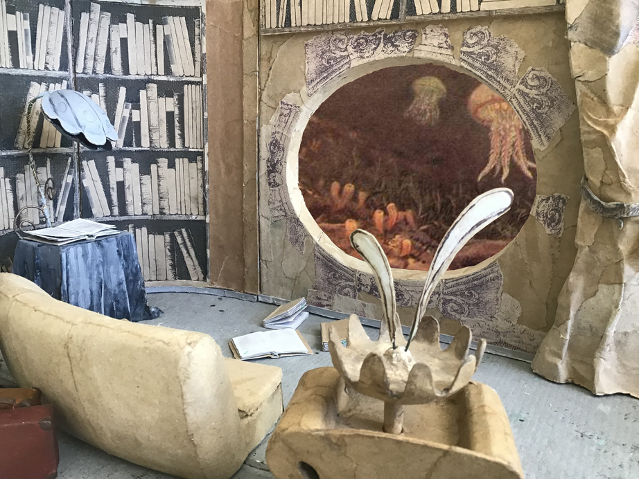 I visby börjar jag med inspiration från illustrationer ur En världsomsegling under havet bygga ett undervattens bibliotke. Jag låter även konstrura en ubåt och den undervattensmiljö med växter, kuperad mark, spindel dit jag tar en promenad. Den miljö vävs samman men egna lägenhet och kombinerade attelje och de objekt jag har där omkring mig.