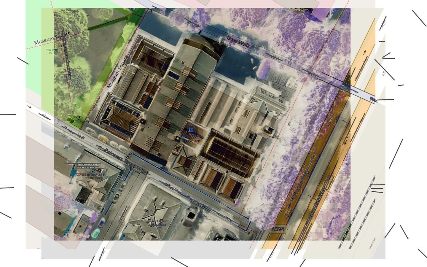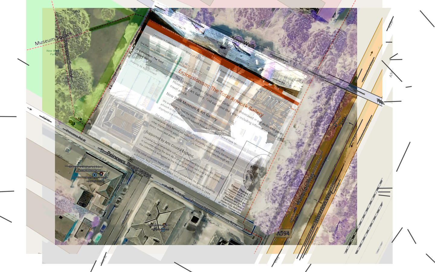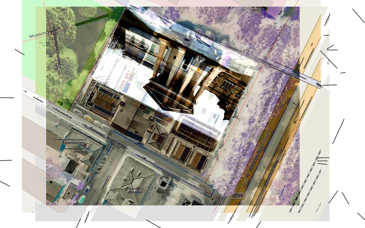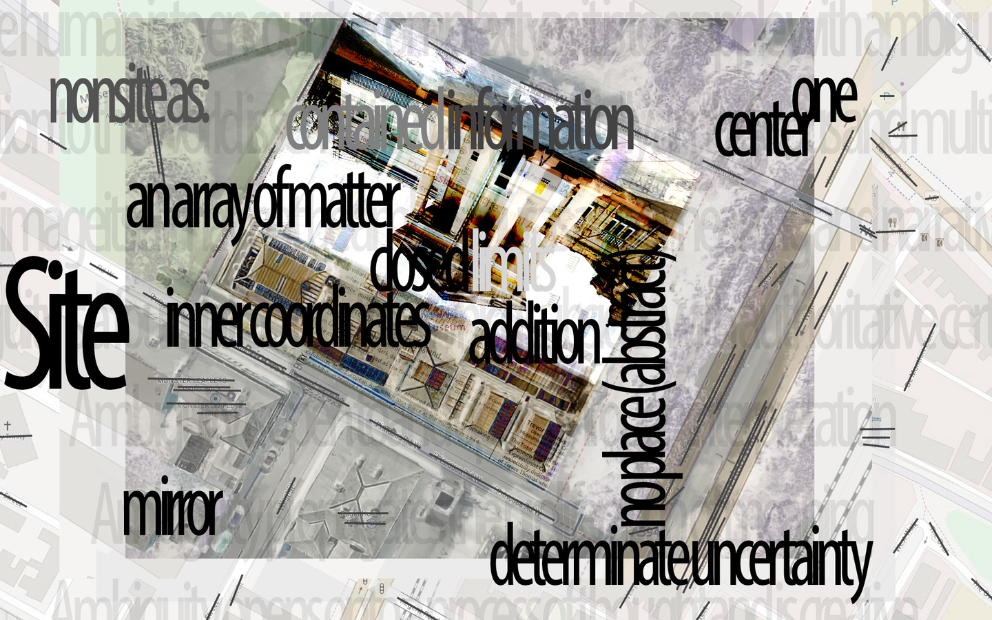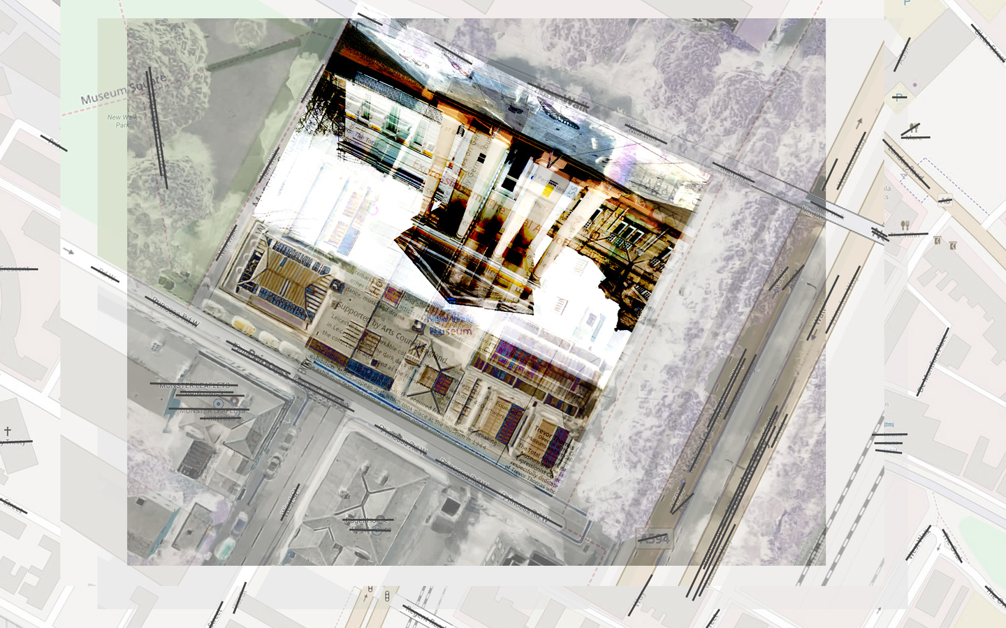 A disambiguation of Particles of Moisture or other Substance Suspended in Air and Visible as Clouds (Kreider and O'Leary, 2015). A staged process. Stage 1: Pre-visit, Faraway, performance of place. A preparatory drawing of site. The drawing situates Robert Smithson’s characteristics of nonsite (closed limits, an array of matter, inner coordinates, addition, determinate uncertainty, contained information, mirror, center, no place (abstract), one) and acknowledges impressions and conceptions through researching historical narratives, maps, cultural outputs… brought to a place (New Walk Museum).