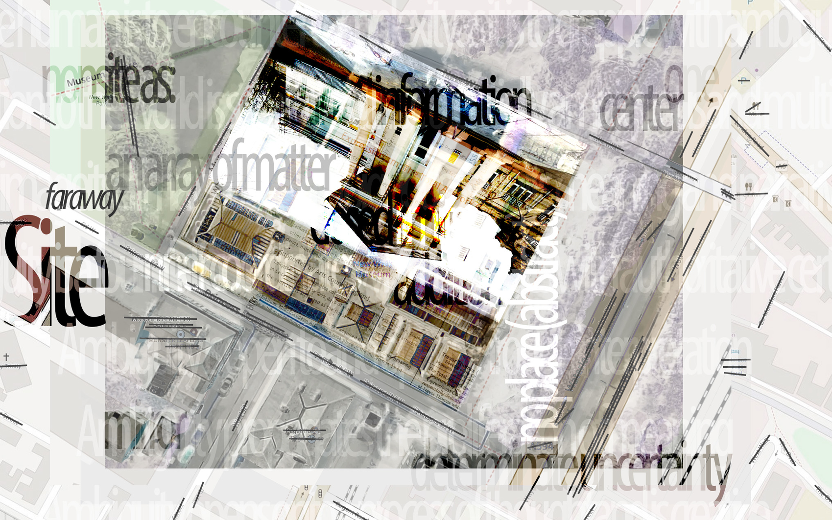 A disambiguation of Particles of Moisture or other Substance Suspended in Air and Visible as Clouds (Kreider and O'Leary, 2015). A staged process. Stage 3: Site, a drawing. The drawing situates Kreider and O’Leary’s characteristics of site (a middle distance; close engagement: material, spatial, temporal, cultural complexity, thereness; afar) and acknowledges movements or spatial practice on the ground (New Walk Museum), experienced phenomenologically and read in all of its semiotic complexity.