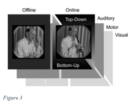 Online imagery is about the imagery that takes place while playing the instrument, for example during a performance. This can take place via a top-down or a bottom-up route. The top-down route is chosen when the performer generates mental images on purpose, while the bottom-up route is taken when the mental images are automatically triggered. Furthermore, Keller (2012) talks about modalities. The different modes of imagery can take place in different modalities: auditory, motor (proprioceptive, kinaesthetic and tactile) and visual. Which modality is used depends on the strategy and the goal of the performer as well as the environment in which the performance takes place. Offline imagery is about the imagery that takes place away from the instrument.
